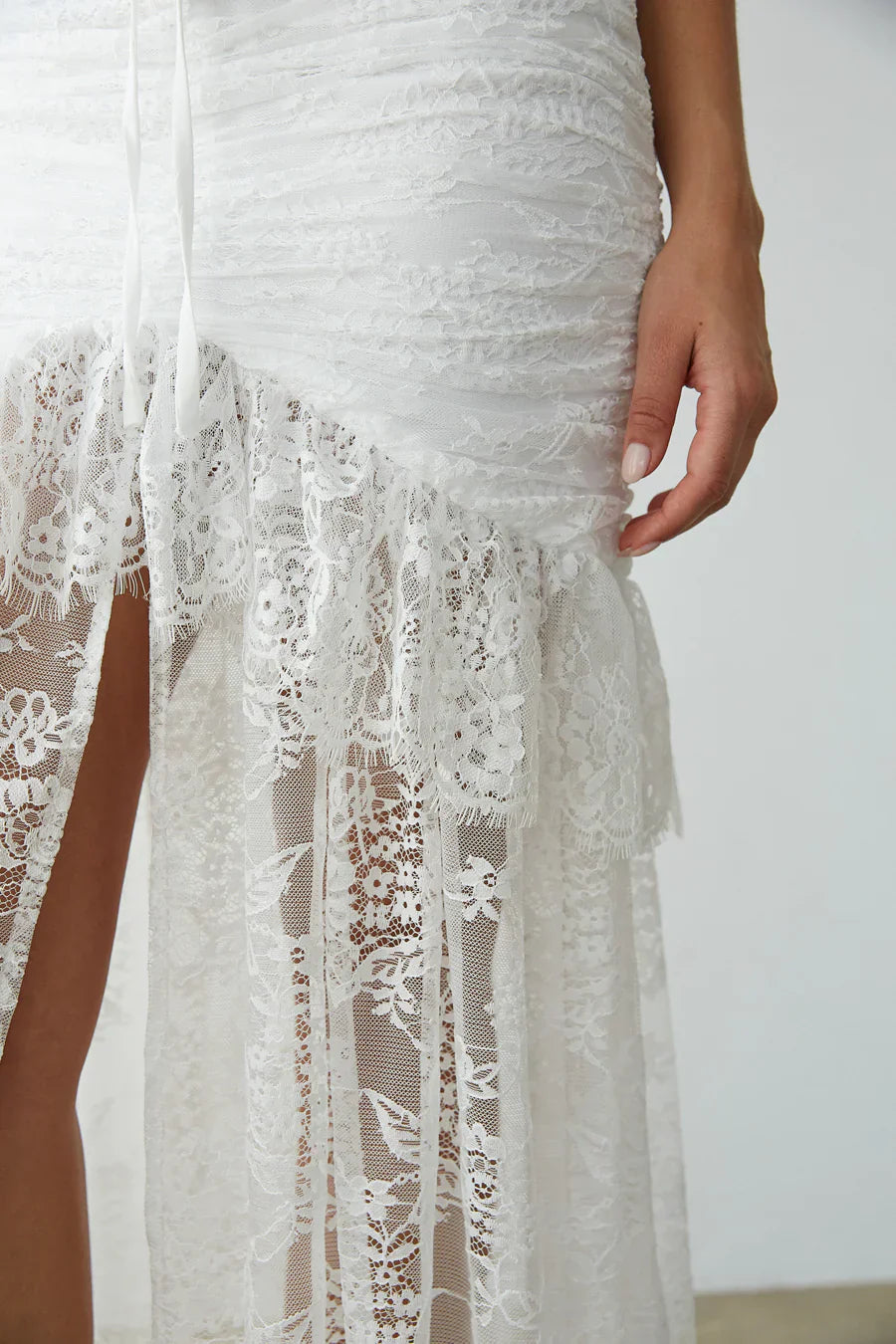 another style within 30 days of receiving your order.Hopelessly romantic, the Aphrodite Lace Ruched Rosette Maxi Dress is ! Fall in love with this lace featuring a lace rosette, high-low silhouette, and ruffle embellishments! Available in white; pair this angelic number with a pair of to complete the look!