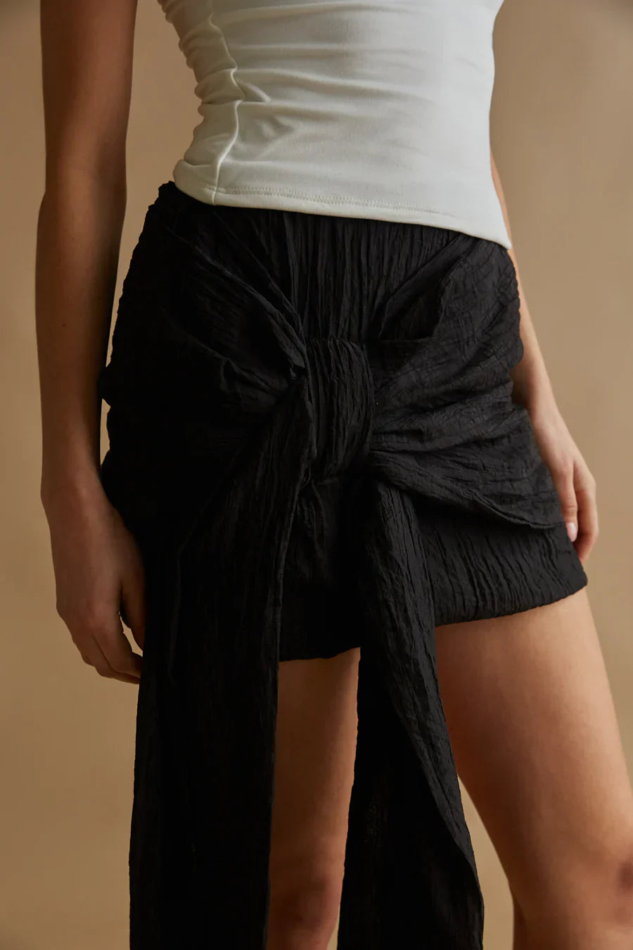 another style within 30 days of receiving your order.Doesn't get more chic than you in the Georgina Bow Drape Mini Skirt! This skirt is made of a crinkle texture material and features an elastic banded high waist and a statement right hip bow with a drape sash. Pair with some chic to complete the look!
