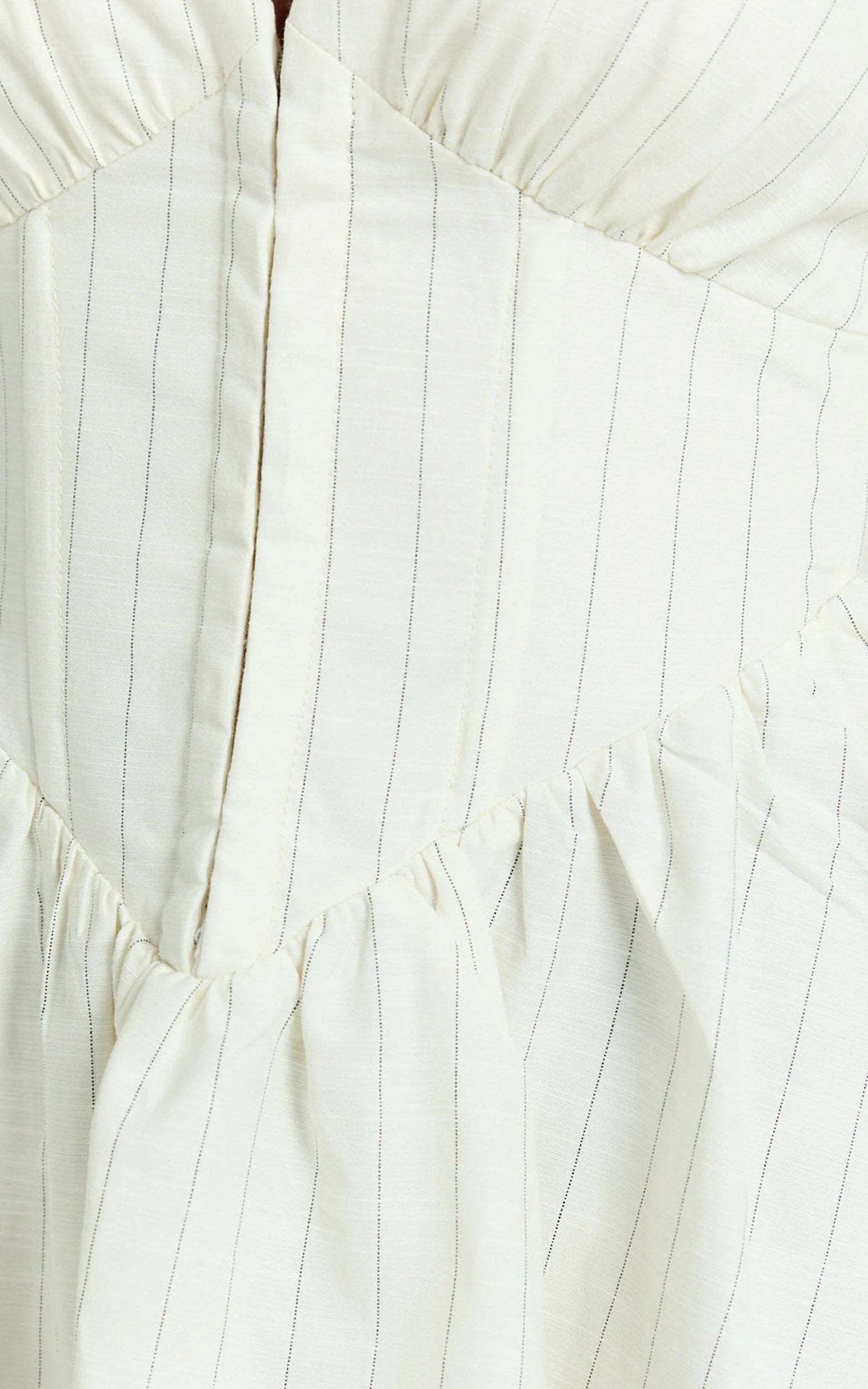 another style within 30 days of receiving your order.Elevate your party look with this cream mini dress, designed with a halterneck and structured waist that accentuates the figure. The fit-and-flare silhouette features a gathered skirt for added movement, while the breathable linen-cotton blend keeps things light and comfortable for day-to-night wear.