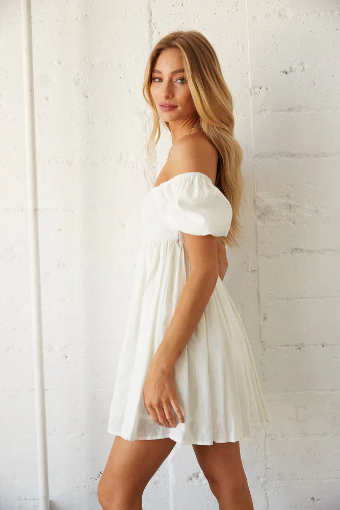 another style within 30 days of receiving your order.Fall in love with the Jasmine Linen Puff Sleeve Babydoll Dress. This perfect mini features a straight across neckline, a flowy pleated babydoll silhouette, and short puff sleeves that can be worn on or off the shoulder. Available in aqua and white. Style with a pair of for the perfect look!