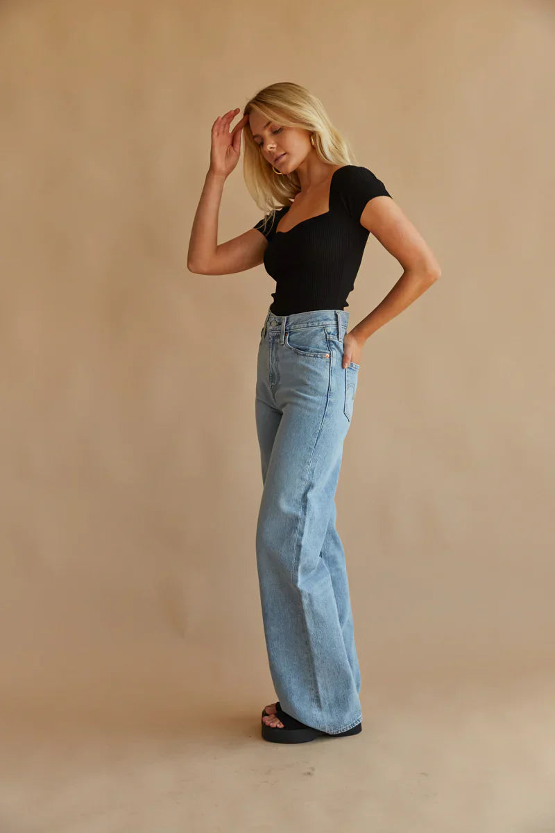 another style within 30 days of receiving your order.Elevate any outfit with the Levi's Ribcage Wide Leg Jeans in Far and Wide! These classic jeans are made of sturdy cotton denim and feature a super high rise fit, 5-pocket styling, belt loops, and a button fly with a branded top button closure. Pair with the to complete the look!