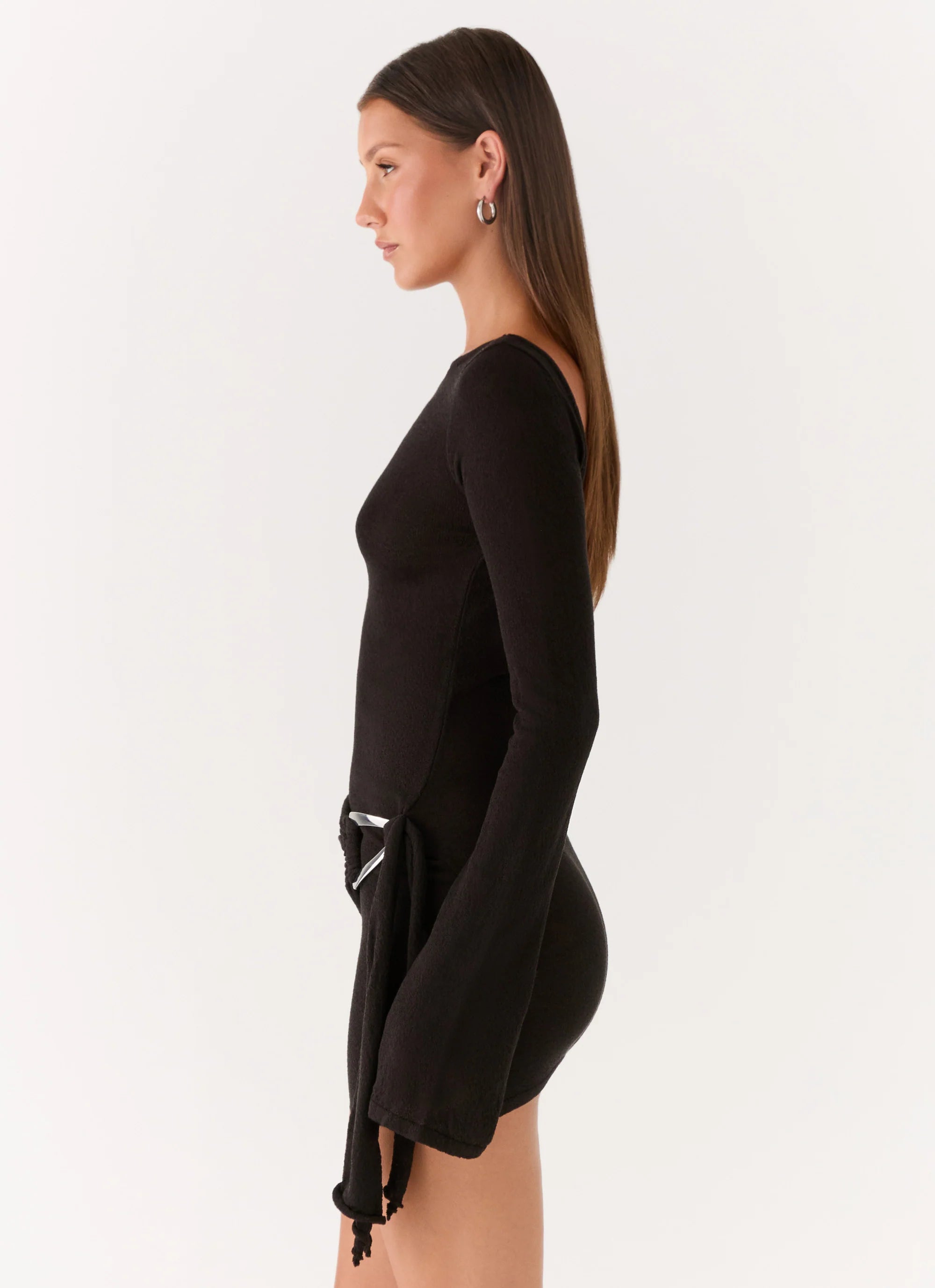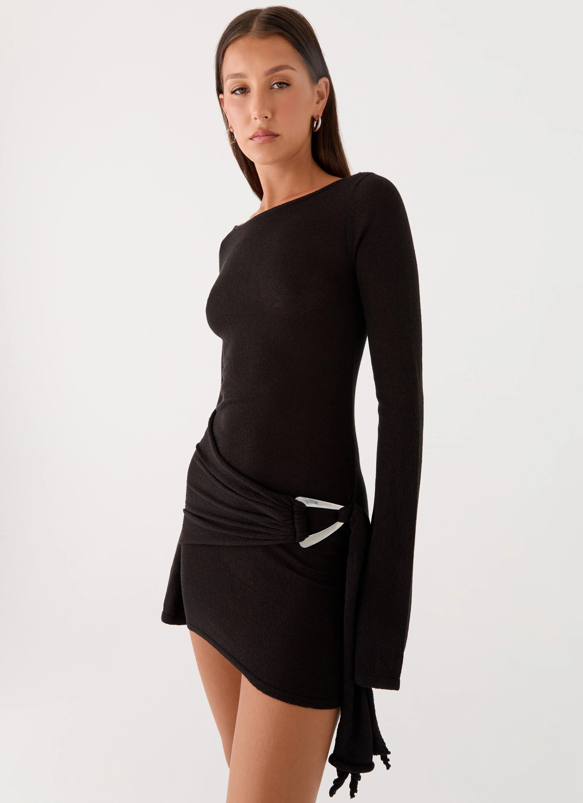 The Niella Long Sleeve Wrap Mini Dress is made for nights that shimmer. Featuring a high wide neckline and open low back, this fitted mini dress has flared sleeves, hardware tie detail, and a semi-sheer, unlined finish for bold, effortless style.
