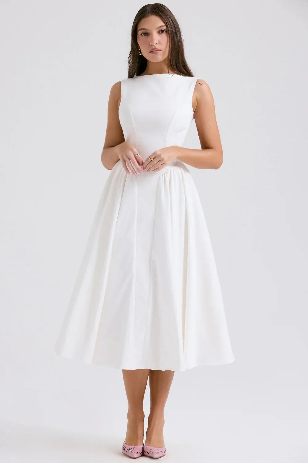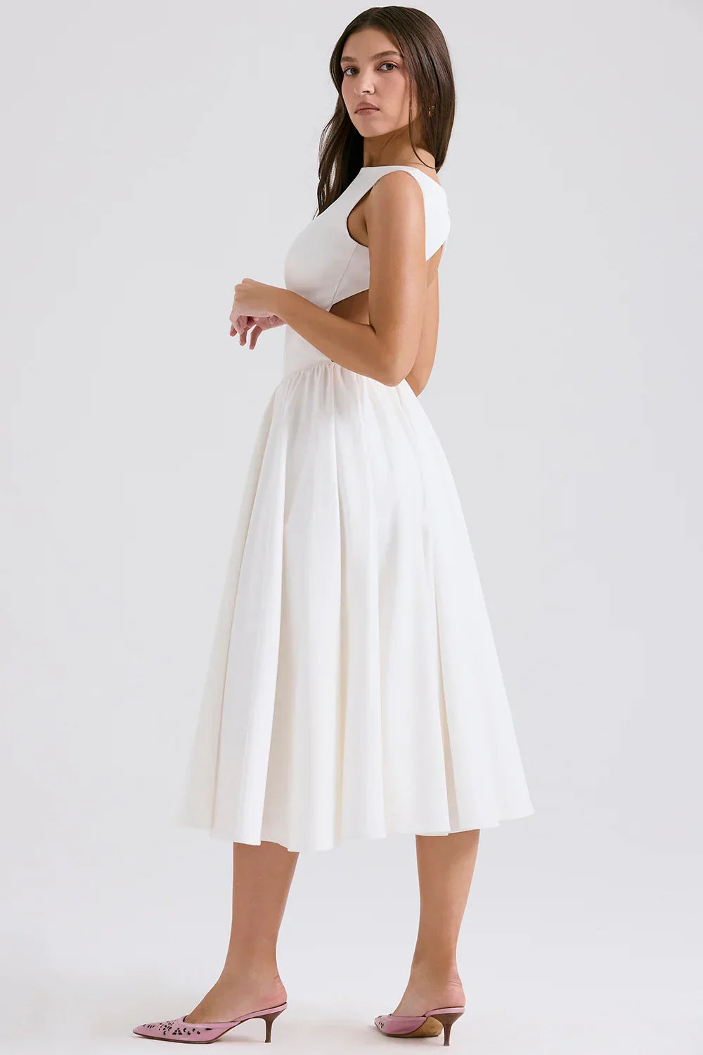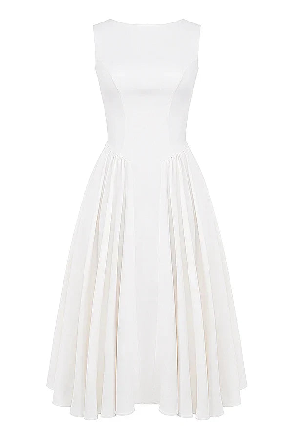 another style within 30 days of receiving your order.Step into sophistication with our Elegant Open-Back Midi A-Line Dress, designed to captivate and enchant. This stunning piece features a classic A-line silhouette that gracefully flows to a midi length, offering both comfort and style.